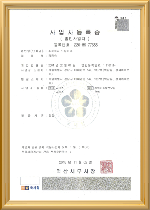 2004년 2월 1일 이민법인 ㈜드림이주를 설립하게 되었습니다.